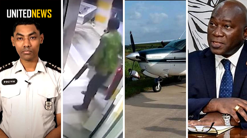 Fotocompilatie: Korpchef, Bryan Isaacs, een momentopname van de roofoverval bij Murphy’s Pub in de IMS Mall, de inbeslagname van een Drugsvliegtuig en de minister van justitie en Politie, Kenneth Amoksi.