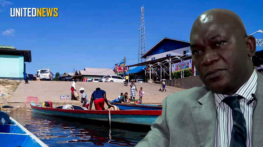 Foto: Minister Kenneth Amoksi van Justitie en Politie, met op de achtergrond de kade van Atjoni.