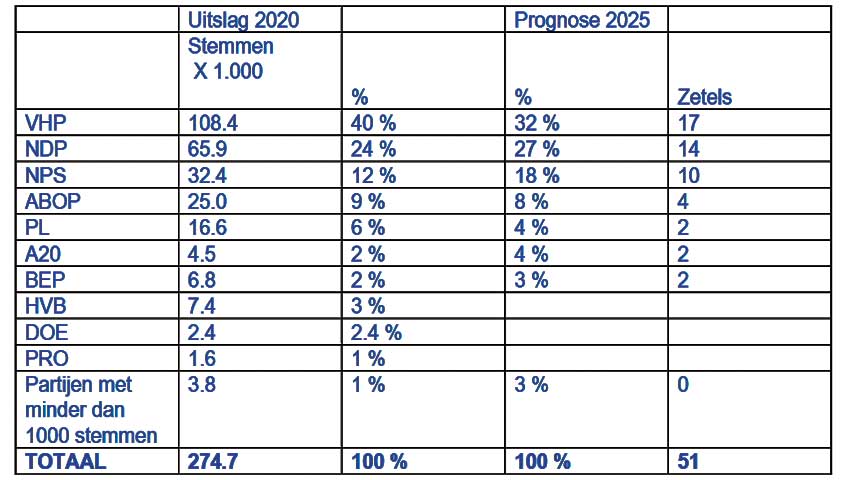 Deze 919 stemmen leveren nu niet eens een vijfde zetel op. De NPS is de partij die de grootste groei doormaakt en klimt van 3 zetels in 2020 naar 10 zetels in 2025 en is nu de derde grote partij geworden. De ABOP valt terug in aantal zetels en houdt van de 8 zetels nu, nog 4 zetels over in 2025. PL en A20 behalen beide 4 % van de stemmen en houden daar 2 zetels aan over. Dat betekent dat A20 van 0 zetels in 2020 nu wel zetels behaalt en dus substantieel is gegroeid. De BEP die 3 % van de stemmen behaalt behoudt de 2 zetels die zij momenteel ook hebben. Geen van de overige partijen of kombinaties, behalen verder een zetel. Voor alle partijen geldt een marge van plus of min 1 zetel.