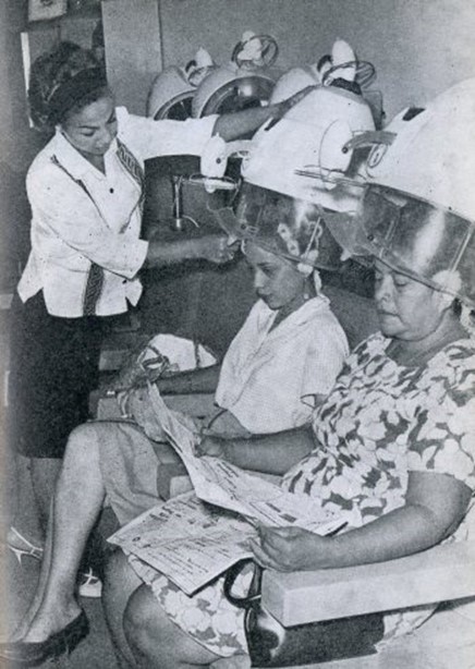 kapster Carla Halfhide, destijds gevestigd onder Palace hotel op het Gouvernementsplein, nu eigenaresse van beauty center Carianana, Paramaribo. Onder de droogkap mevrouw Gits-Schloss.