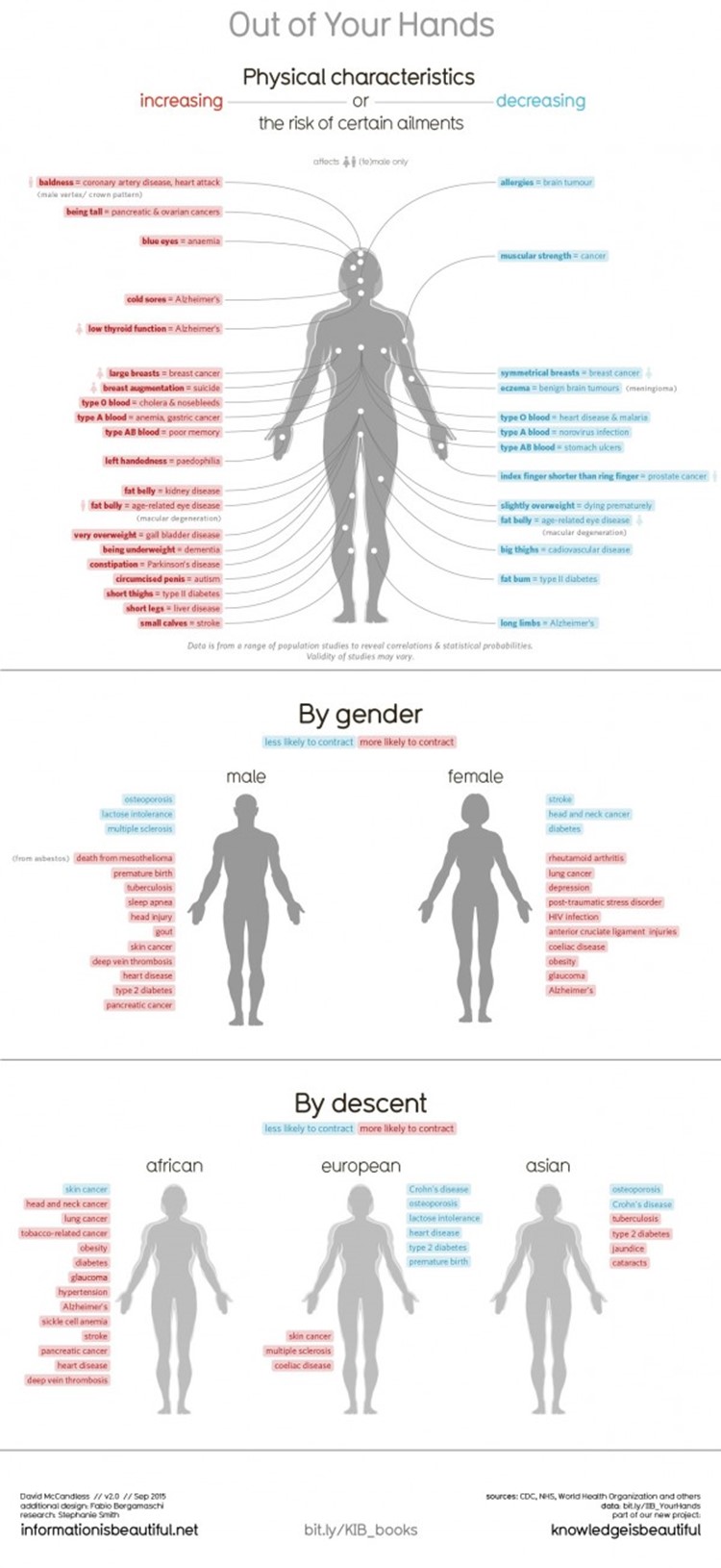 De voortschrijdende toename van kennis van het menselijk lichaam heeft al tot heel wat nieuwe inzichten geleid. Wat wij begrijpen van het lichaam is nog maar een fractie van wat er te weten valt. “We” zijn echter al lichtjaren verder ten opzichte van enkele decennia terug. Denk nog maar eens terug aan de tijd waarin iedereen ervan overtuigd was dat roken de longen zuiverde. Inmiddels weten we wel beter. In de loop der jaren zijn er door onder andere universiteiten, ziekenhuizen, onderzoekscentra en de World Health Organization verbanden aangetoond tussen bepaalde eigenschappen van het lichaam en toename of juist afname van kans op allerlei ziekten en kwalen. Hierbij enkele highlights die voor jou belangrijk kunnen zijn. Let wel: het gaat hier om aangetoonde verbanden van bepaalde eigenschappen en verhoogde of verlaagde risico’s op bepaalde aandoeningen. Waarom deze verbanden bestaan, is nog niet altijd ontdekt.