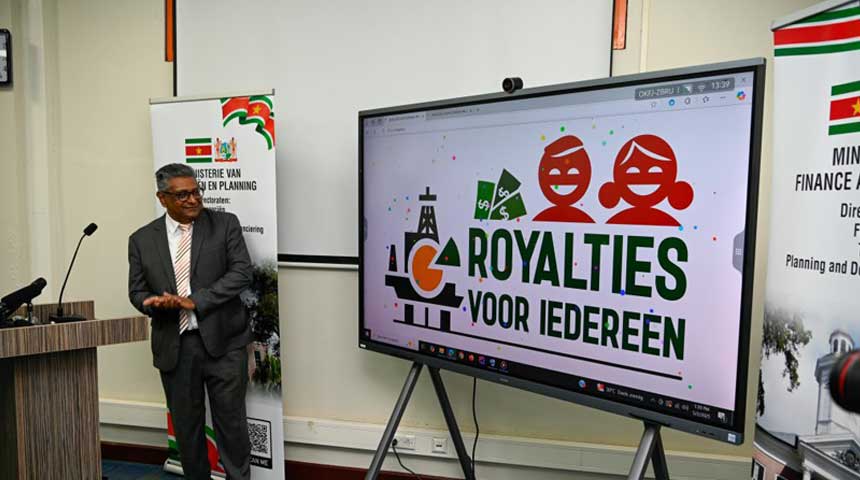 Foto: minister Raghoebarsing van Financiën en Planning, lanceert website ‘Royalty voor Iedereen’.
