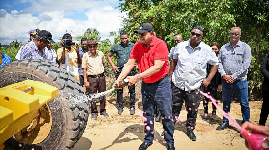 Foto: President Santokhi zegent het zwaar materieel met een plengoffer voor een vlot verloop van de werkzaamheden.