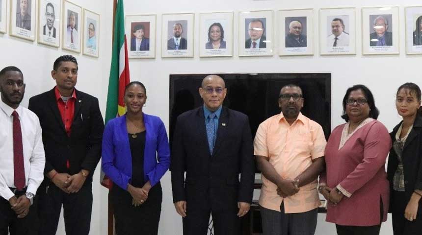 De leden van de commissie ‘Evaluatie Wet Minimumloon 2019’. Vlnr: Sidney Alleyne, Ashween Orie, Wihtley Lodik, minister Steven Mac Andrew, Glenn Piroe (voorzitter), Shoblina Chotkhan-Somai en Mandy Troenopawiro.