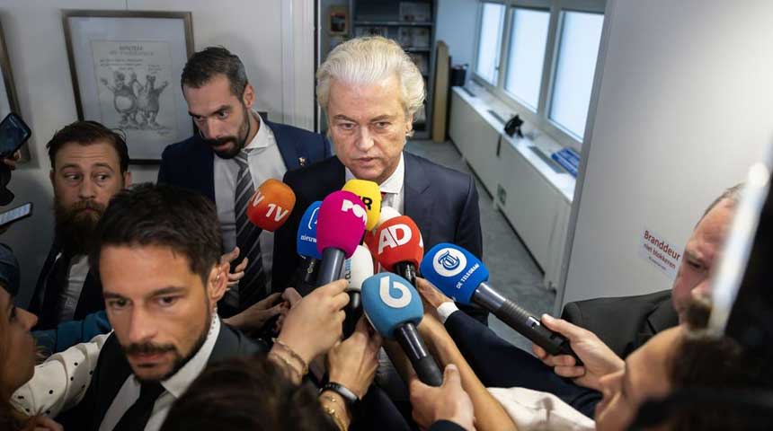 Foto: PVV-leider Geert Wilders spreekt met de pers.| Bron: NOS