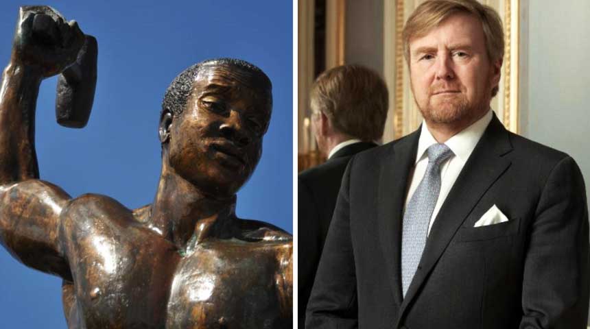 Foto: Links, Het bronzenbeeld van de verzetsheld, Tula Op Curaçao en Rechts, Koning Willem-Alexander van het Koninkrijk der Nederlanden. | Bron: Caribisch Netwerk.nl